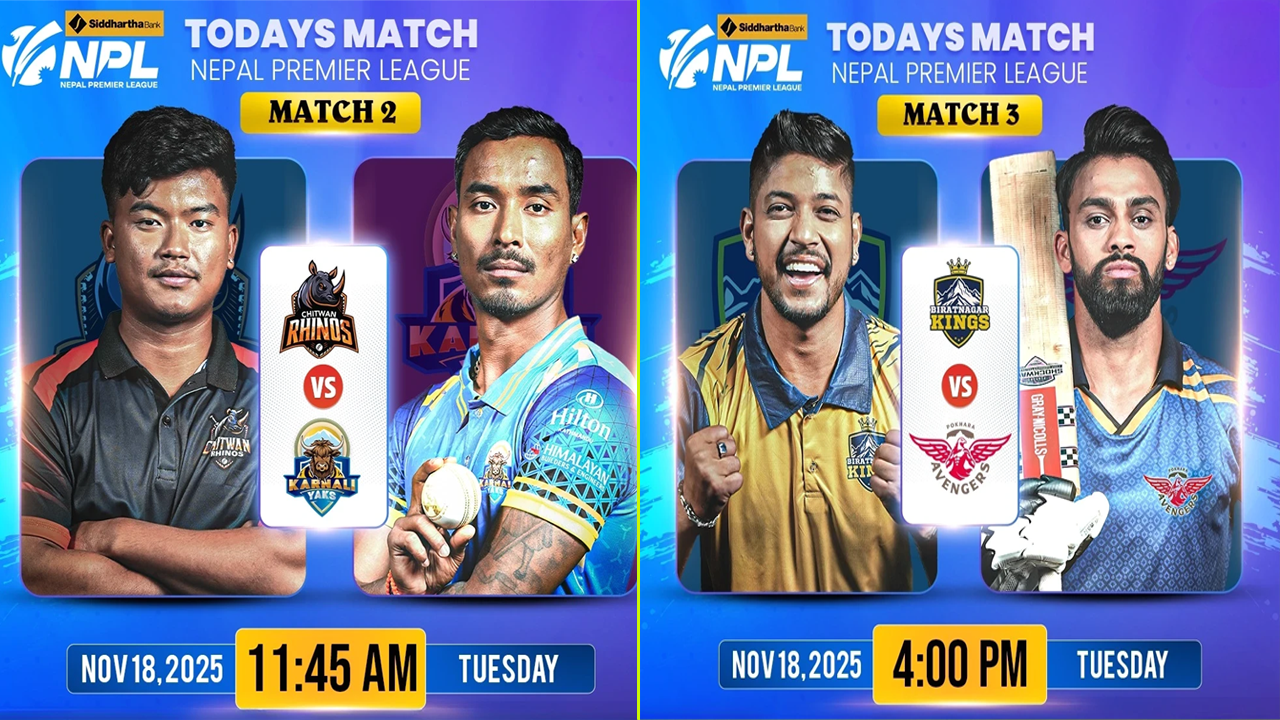 काठमाडौँ,२ मङ्सिर - दोस्रो संस्करणको नेपाल प्रिमियर लिग (एनपीएल) अन्तर्गत आज दुई खेल हुँदै छन् । मंगलबारको पहिलो खेलमा चितवन राइनोज र कर्णाली याक्स भिड्दैछन् । यो खेल बिहान ११ः४५ बजे सुरु हुनेछ । चितवन कुशल मल्लको कप्तानीमा मैदानमा उत्रने छ भने कर्णालीको कप्तान सोमपाल कामी छन् ।