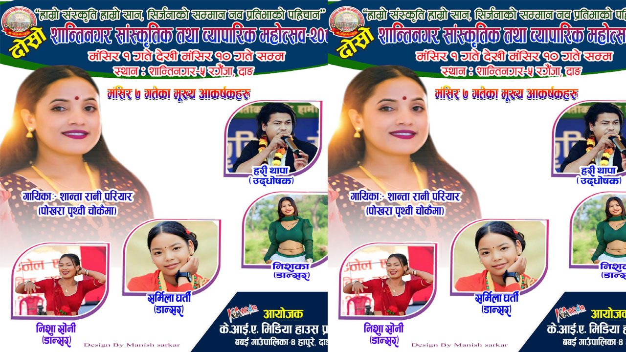 दाङ ७ मंसिर - दोस्रो शान्तिनगर सांस्कृतिक तथा व्यापारिक महोत्सवमा आज लोकप्रिय गायिका शान्तारानी परियारले प्रस्तुति दिनुहुने भएको छ । ‘म त ढले ढले, पोखरा पृथीवी चोकैमा कति केटा छैनन रे होसैमा लगाएतका गितहरुबाट सर्वाधिक चर्चा कमाउन सफल गायिक परियारले आजको सांस्कृतिक मञ्चमा आकर्षक प्रस्तुति दिने महोत्सव आयोजकले जनाएको छ ।